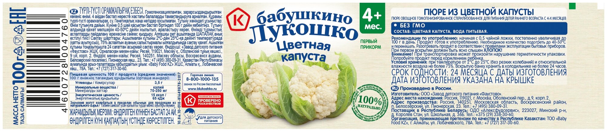 Пюре Бабушкино Лукошко цветная капуста, с 4 месяцев, 100 г