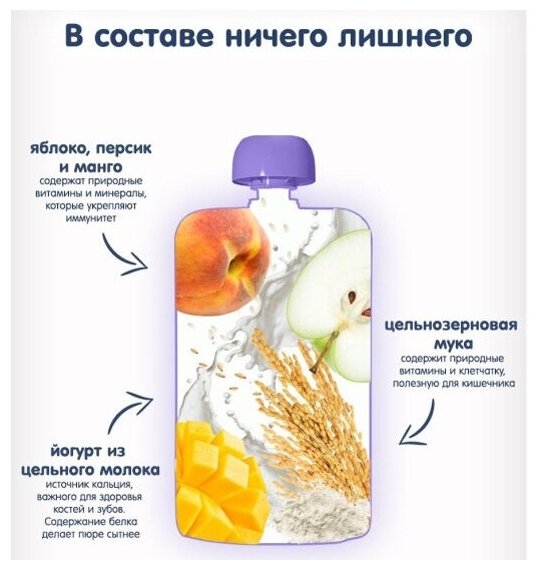 Пюре детское Fleur Alpine манго, персик, яблоко с йогуртом и цельными злаками, с 6 месяцев, 120 г (6 штук)