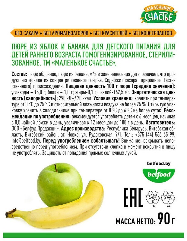 Ниже Вы можете прочитать отзывы на Маленькое счастье 90гр Яблоко-Банан пюре х 12 шт, ознакомится с подробными характеристиками, посмотреть интересные обзоры и фотографии на Маленькое счастье 90гр Яблоко-Банан пюре х 12 шт.
