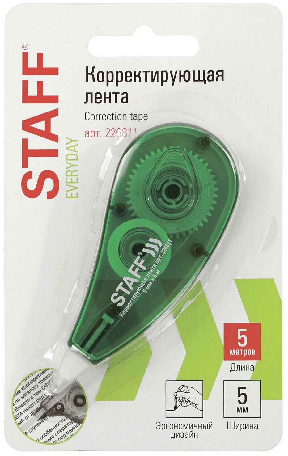 Корректирующая лента STAFF "EVERYDAY", 5 мм х 5 м, корпус зеленый, блистер, 226811 (цена за 1 ед.товара)