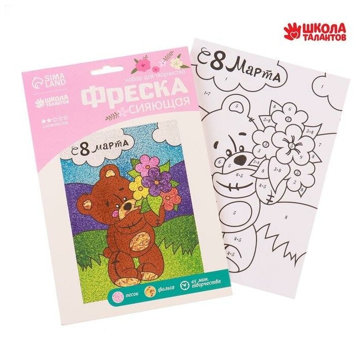 Фреска песком Школа талантов сияющая, с 8 марта "Мишка" с блестками и фольгой