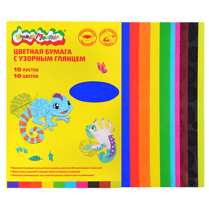 Цветная бумага Каляка-Маляка 1-сторонняя, глянец с узором, 10 л истов, 10 цветов, 170 г/м2, А4, 190х290 мм (БЦГКМ10)