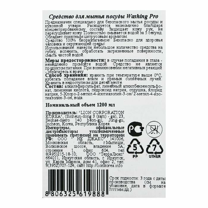 Lion Жидкость для мытья посуды Washing pro, 1.2 л