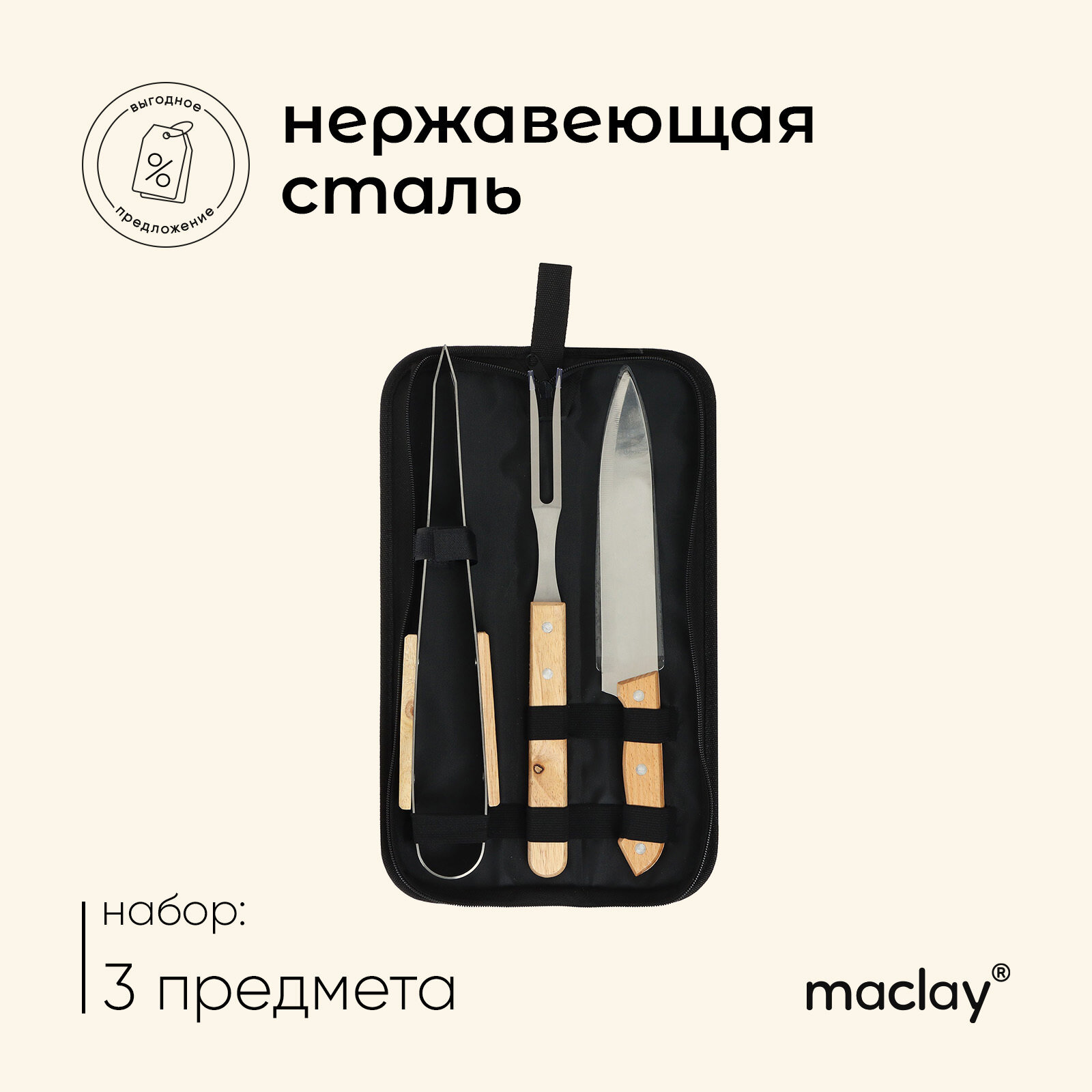 Набор для барбекю Maclay: нож, вилка, щипцы, 33 см