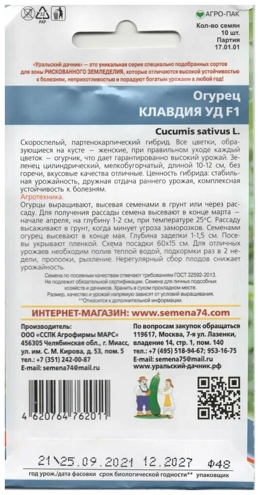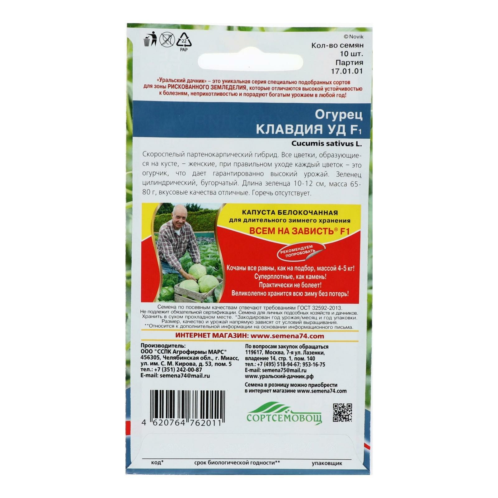 Семена Огурец Клавдия F1 10 семечек Уральский дачник интересное: