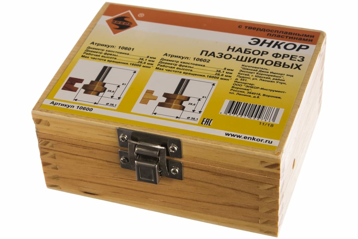 Набор фрез пазо-шиповых 2шт. твердосплав ц/хв 8 энкор ПРОФ Ø38.1х28.6 дер/ящ 10600