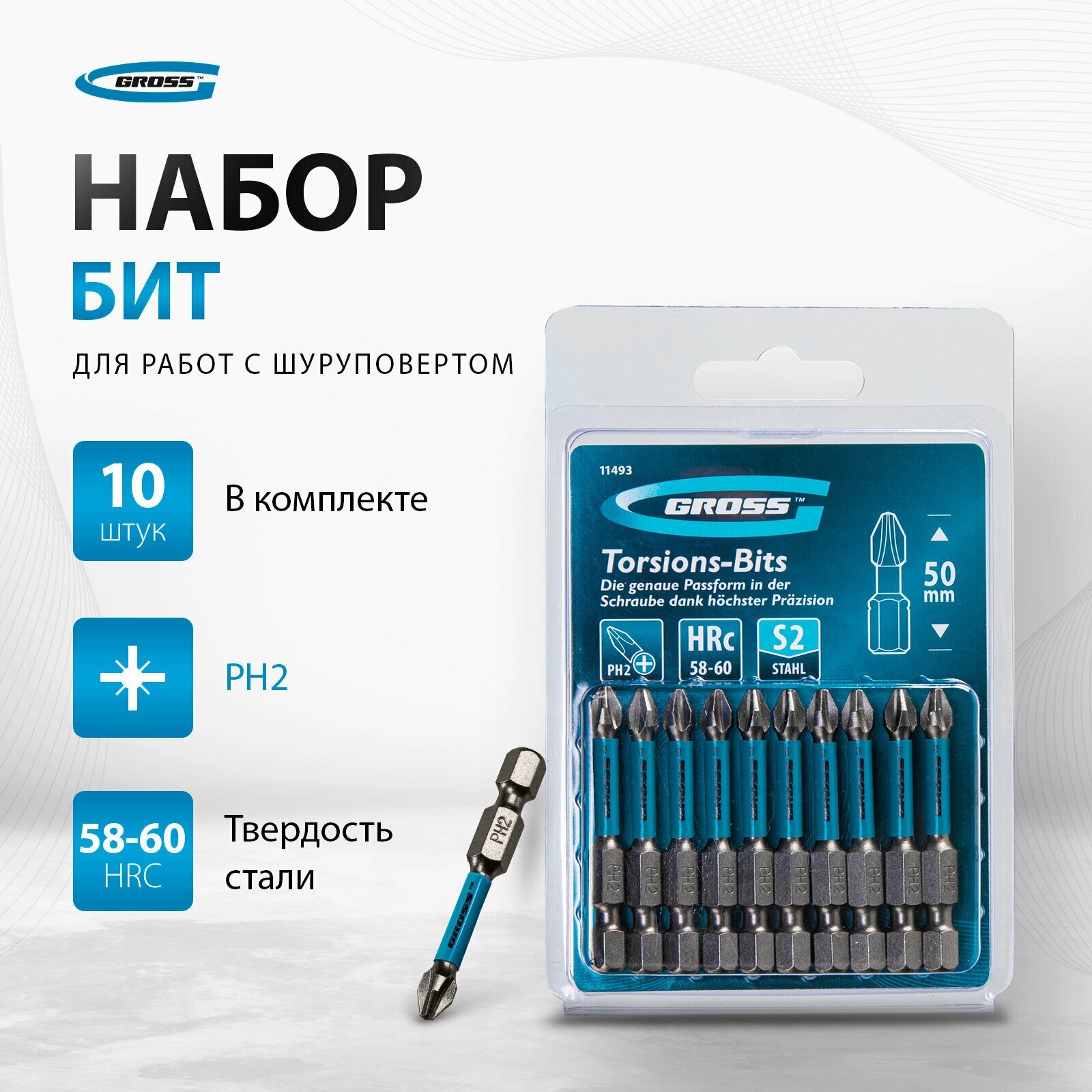 Набор бит торсионных PH2 x 50 мм, для ударных шуруповертов, 10 шт. Gross [11493]