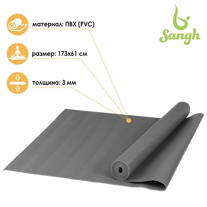 Коврик для йоги 173 х 61 х 0,3 см, цвет серый Sangh 3098564 .