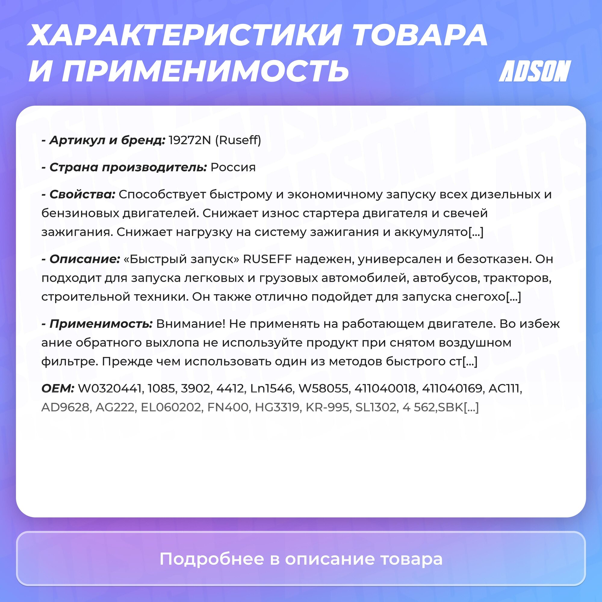 Ниже Вы можете прочитать отзывы на Быстрый запуск двигателя Ruseff 19272N аэрозоль 250 мл, ознакомится с подробными характеристиками, посмотреть интересные обзоры и фотографии на Быстрый запуск двигателя Ruseff 19272N аэрозоль 250 мл.