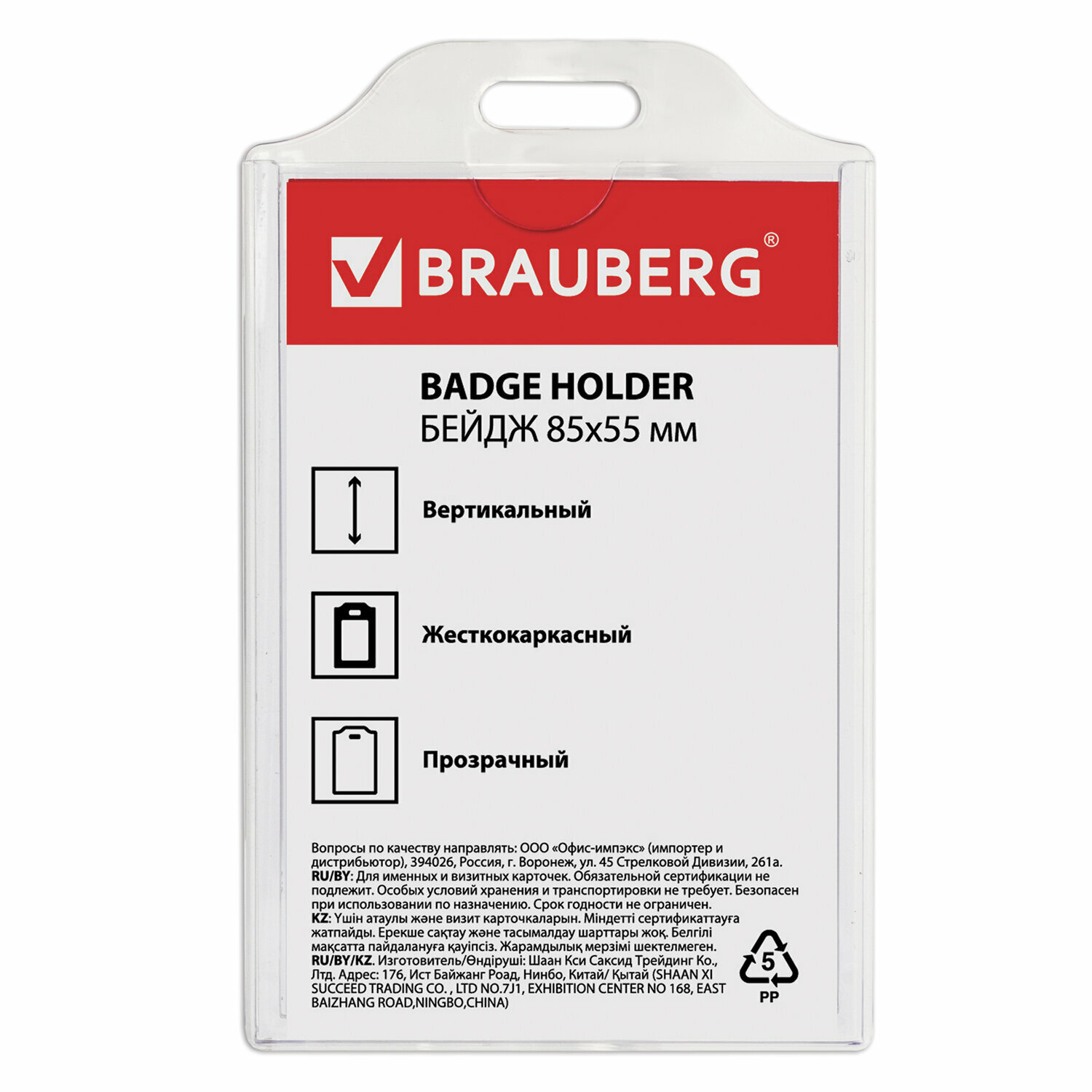 Бейдж вертикальный Brauberg, 85х55мм, твердый пластик, без держателя, прозрачный (235744)