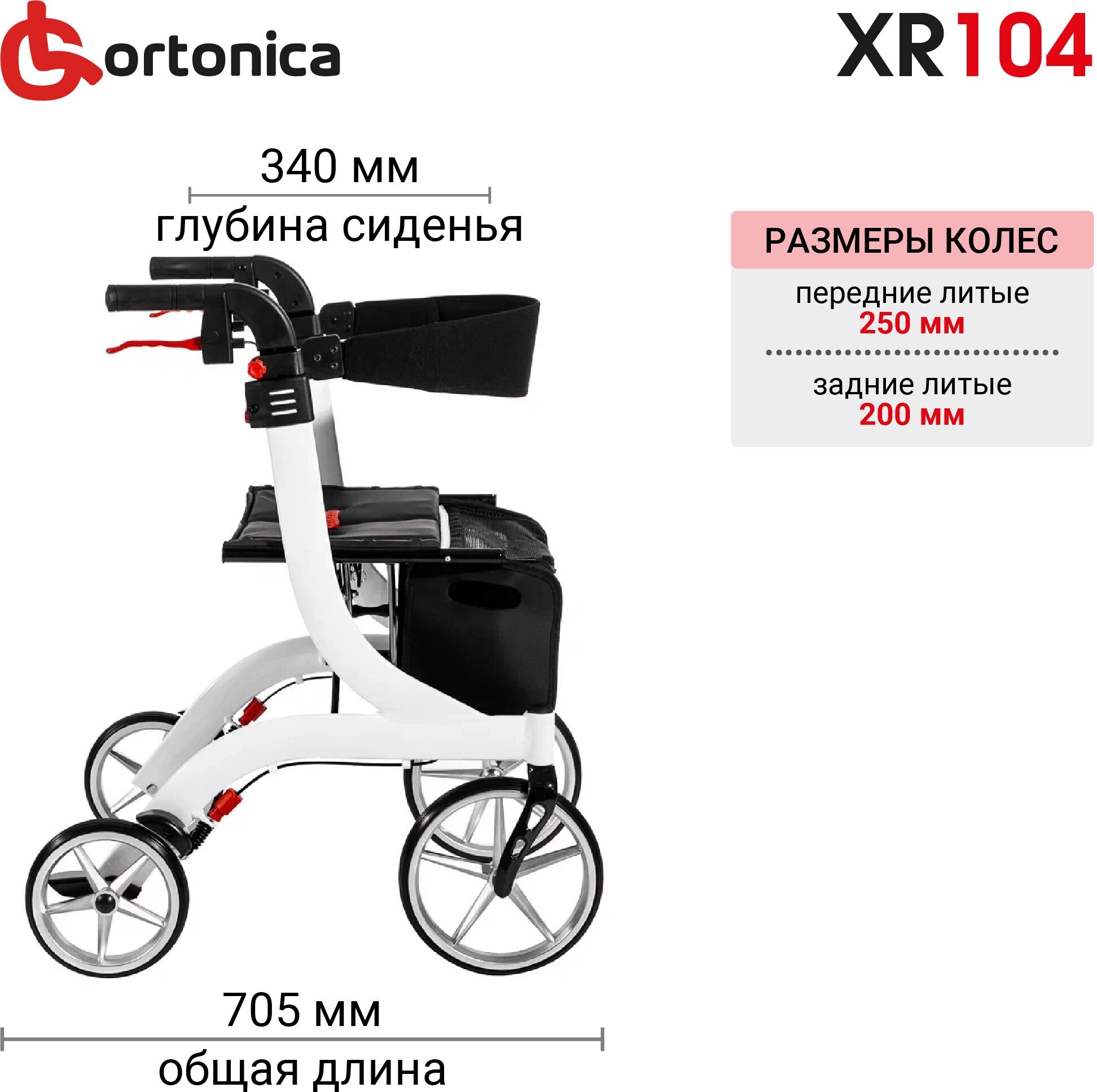 Ходунки-роллаторы для пожилых и инвалидов 4 колеса складные регулируемые по высоте алюминиевая рама до 110 кг Ortonica XR 104 белые