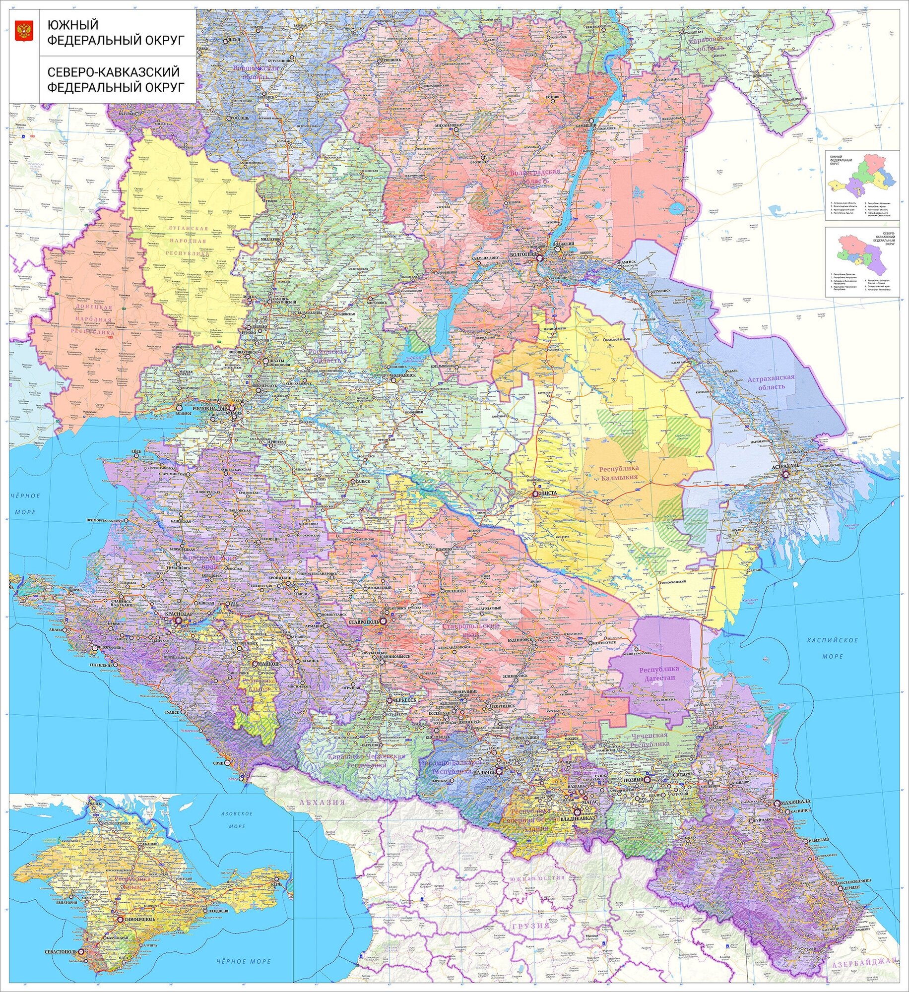 Купить Настенная карта Южного и Северо-Кавказского фед. округа 165 х 150 см (на самоклеющейся пленке)