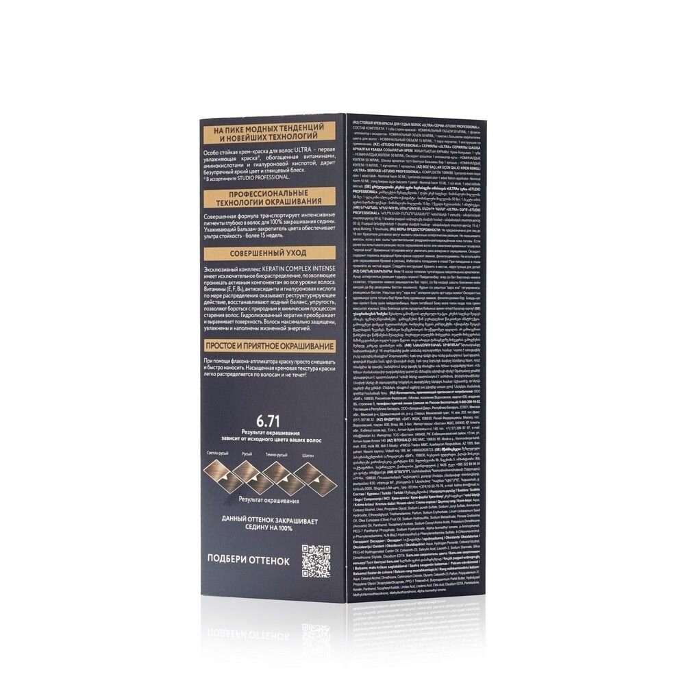 Studio Professional Ultra Крем-краска стойкая для седых волос (крем-краска туба 50 мл, оксидант 50 мл, бал-закрепитель 15 мл + перч), тон 6.71 холодный коричневый