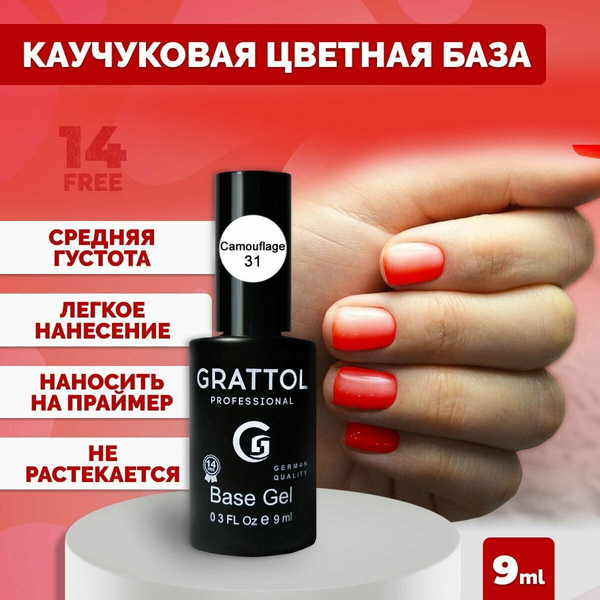 Grattol, Rubber Base Camouflage - база каучуковая камуфлирующая для гель-лака (№14), 9 мл