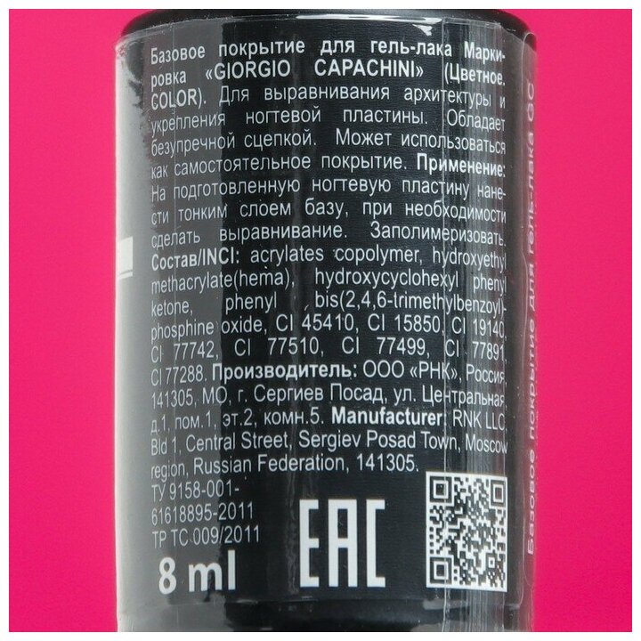 Giorgio Capachini, Базовое покрытие для гель-лака.Маркировка "GIORGIO CAPACHINI"8 мл (цветное №COLOUR") т.30, 20209061