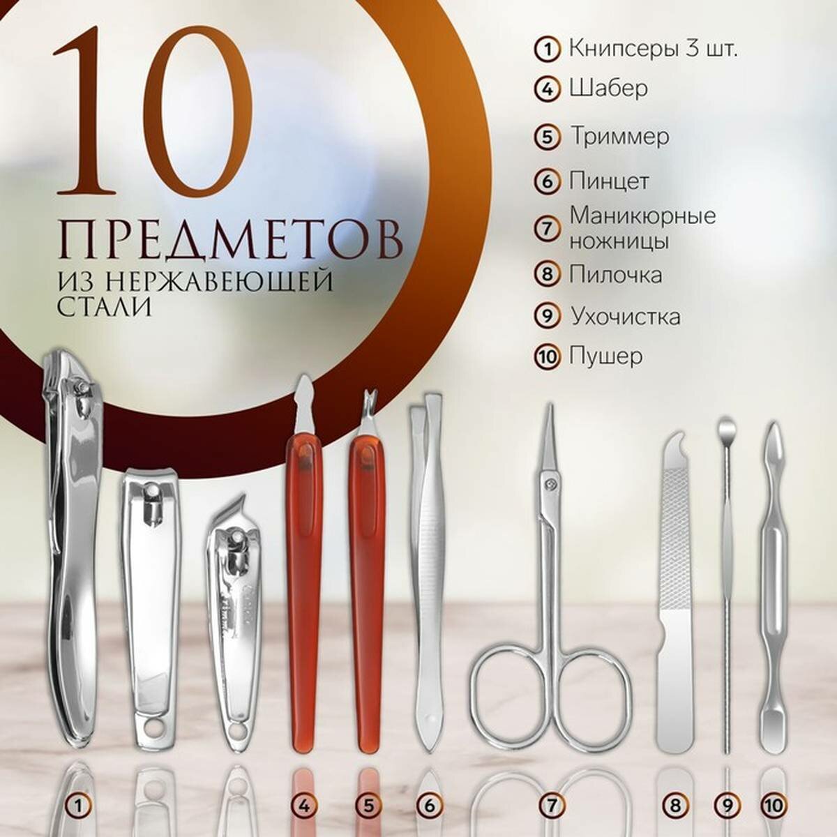 Набор маникюрный, 10 предметов, в футляре, цвет коричневый интересное: