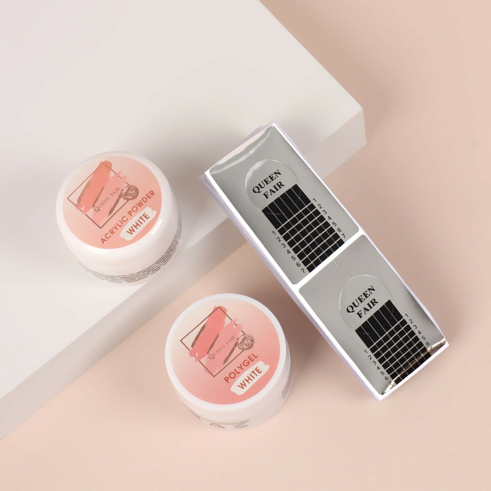 Queen fair Набор для наращивания ногтей, 3 предмета: нижние формы, белая акриловая пудра и гель