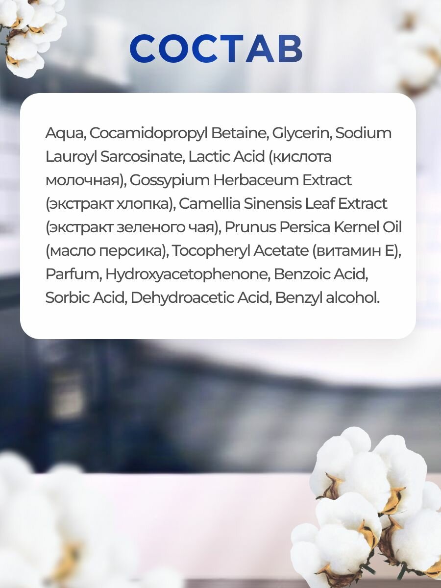 | Состав | aqua, cocamidopropyl betaine, glycerin, sodium lauroyl sarcosinate, lactic acid (кислота молочная), gossypium herbaceum extract (экстракт хлопка), camellia sinensis leaf extract (экстракт зеленого чая), prunus persica kernel oil (масло персика), tocopheryl acetate (витамин е), parfum, hydroxyacetophenone, benzoic acid, sorbic acid, dehydroacetic acid, benzyl alcohol |