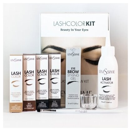 | Комплектация | краска для бровей и ресниц LeviSsime Lash Color №7-7 (светло-коричневая), краска для бровей и ресниц LeviSsime Lash Color №3-7 (коричневая), краска для бровей и ресниц LeviSsime Lash Color №1-6 (иссиня-черная), краска для бровей и ресниц LeviSsime Lash Color №1-1 (графит), оксидант LeviSsime Lash Activator 1.8% 90мл, гель-маска для стайлинга и фиксации цвета LeviSsime Brow Styling Gel 10мл, плоская скошенная кисть для окрашивания, стеклянная емкость для смешивания краски |