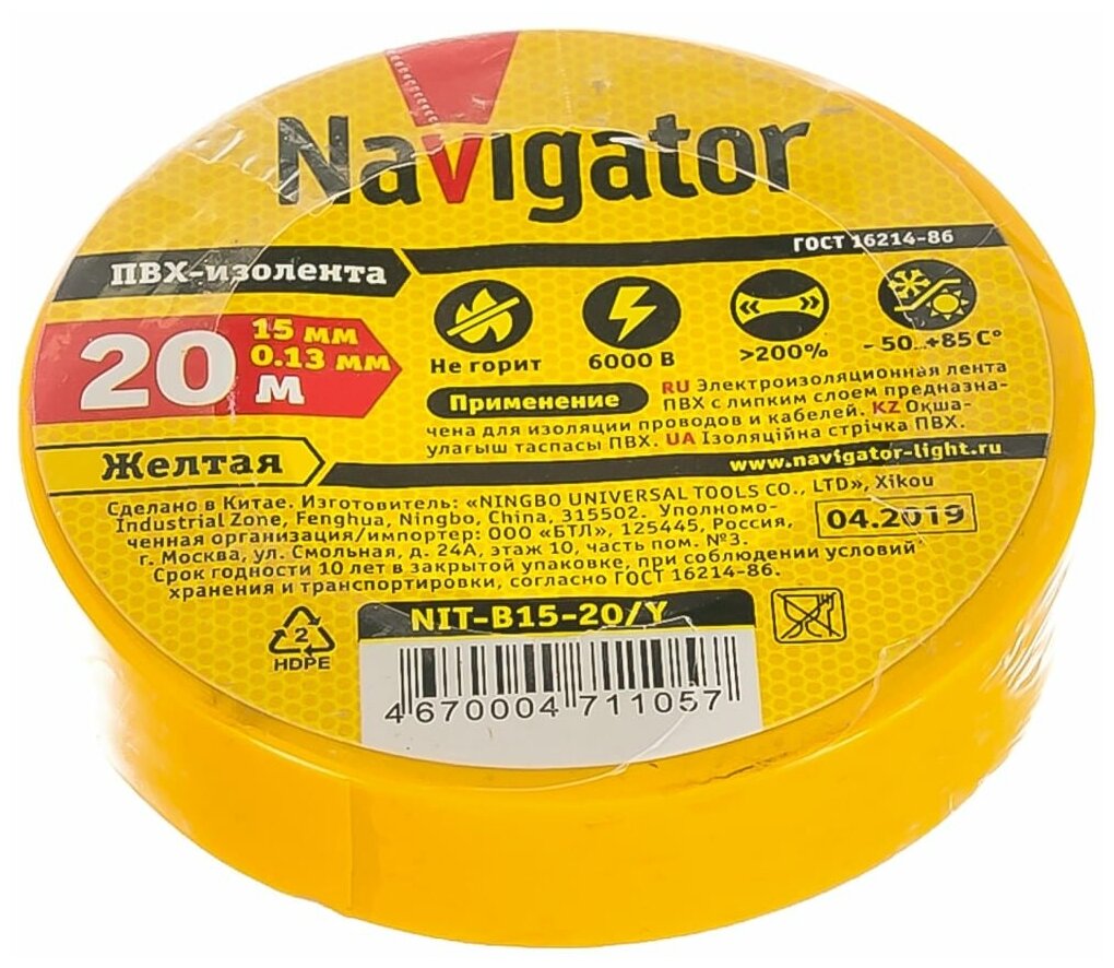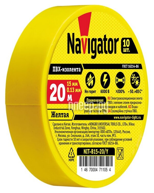 Изолента Navigator NIT-B15-20 ПВХ 15 мм x 20 м, желтый
