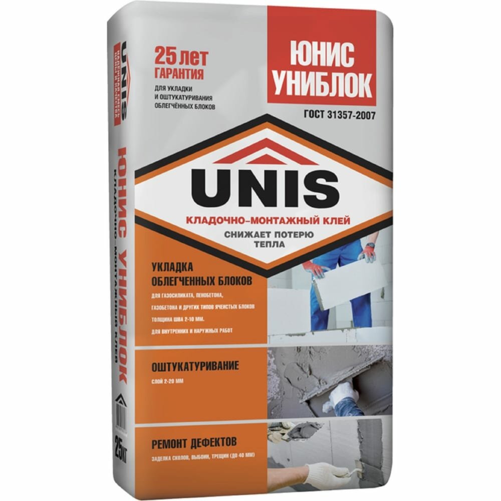 Юнис Униблок клей монтажный для ячеистого бетона (25кг) / UNIS Униблок цементный кладочно-монтажный клей для легких блоков (25кг) интересное: