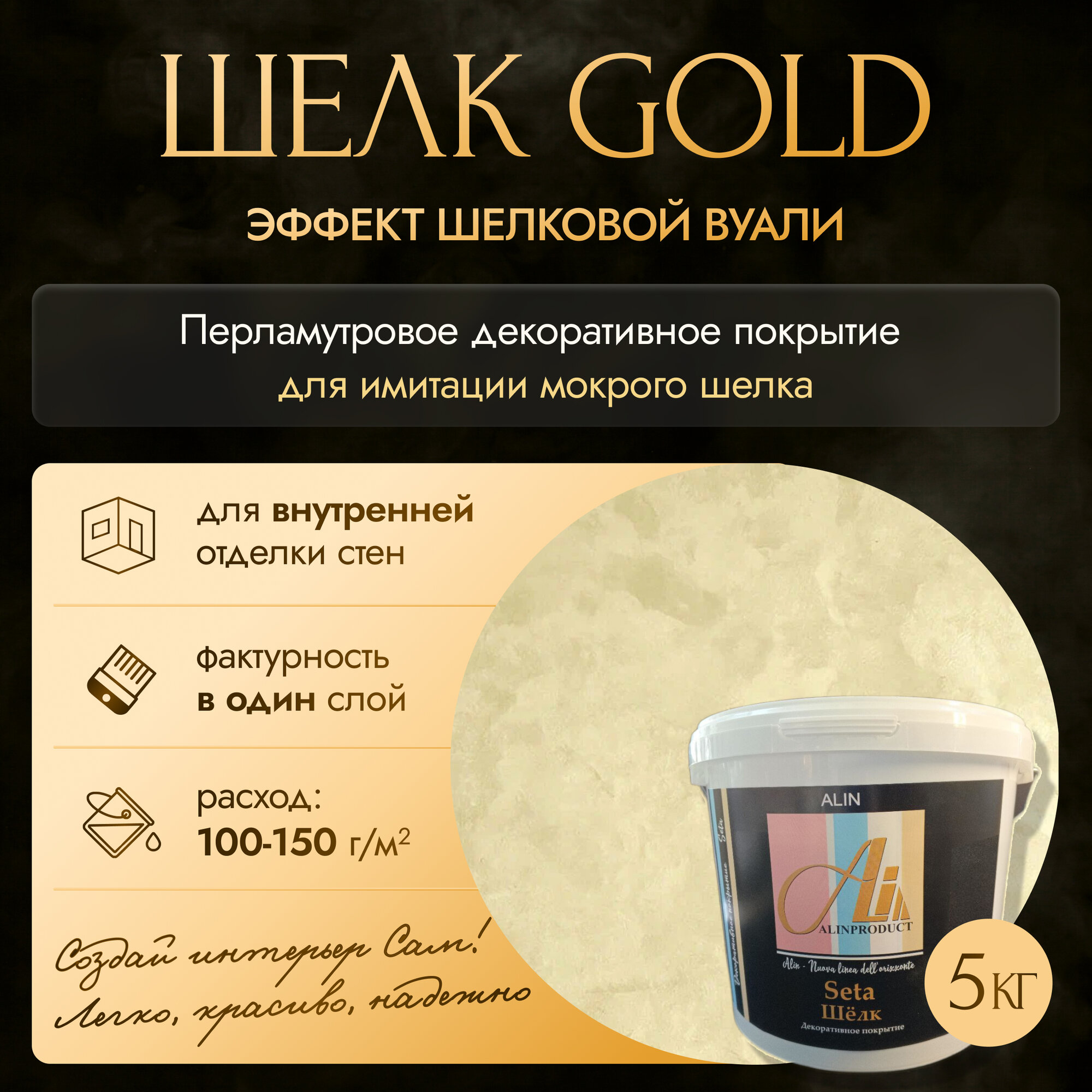 Краска, Декоративное покрытие ALINPRODUCT Шелк Сета Seta база золото - перламутровая декоративная штукатурка для имитации мокрого шелка Акриловая, Фактурная, *Декоративная, Глянцевое покрытие, 5 кг, золотистый