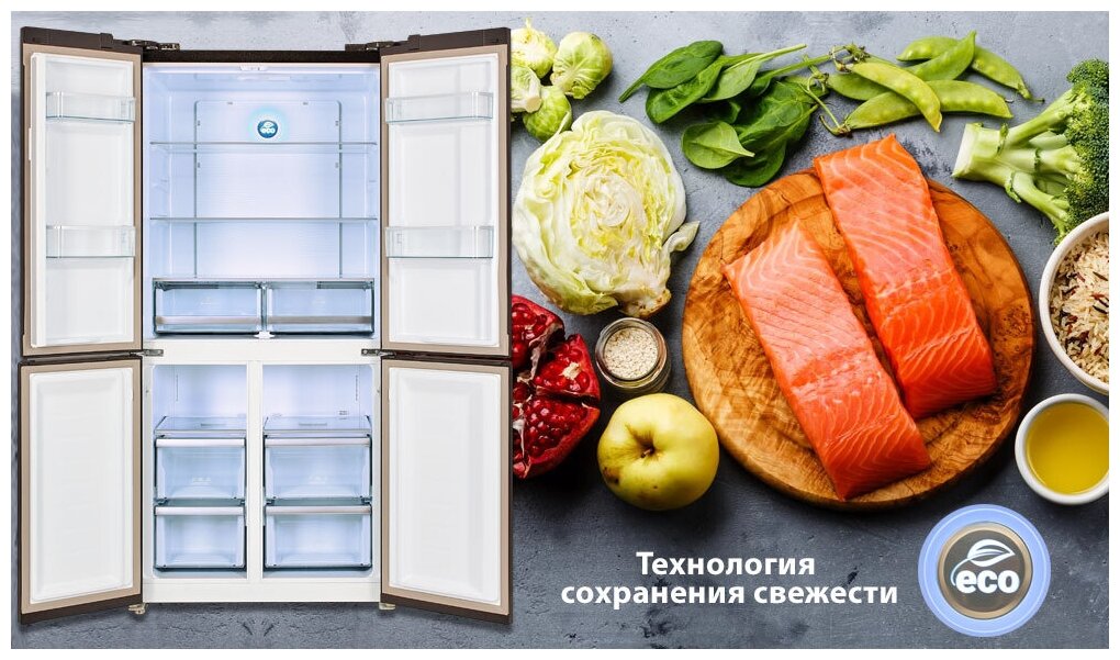 Холодильник HIBERG RFQ 490DX NFGL INVERTER, Cross Door, 4 двери, отдельностоящий, Total No Frost, инвертор, 490 л объем, цвет лайм стекло интересное:
