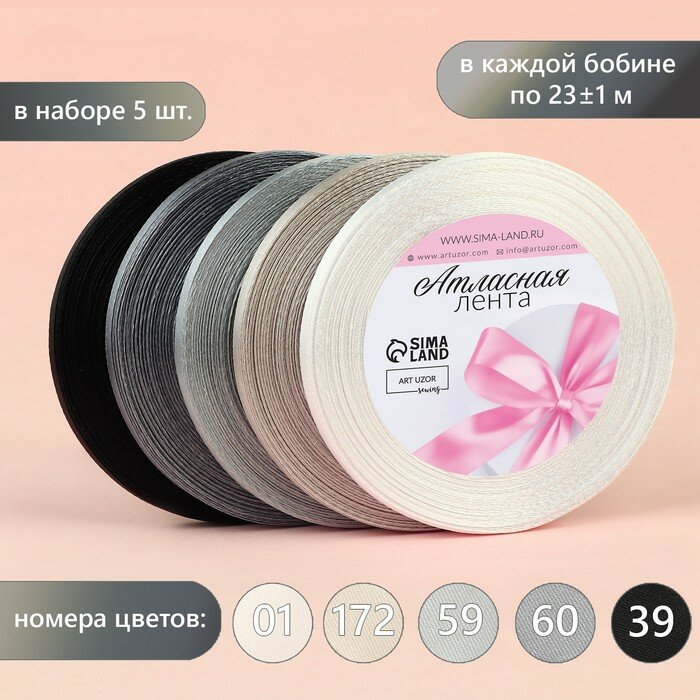 Арт Узор Набор атласных лент, 5 шт, размер 1 ленты: 6 мм x 23 ± 1 м, цвет серый спектр