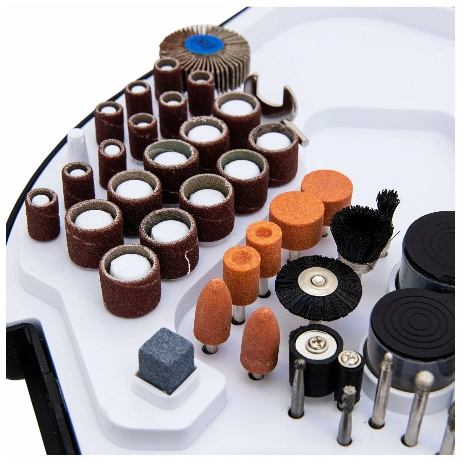 | Комплектация | гравер, гибкий вал, струбцина, ключ для наладки гравера, держатель гравера, насадка для точных работ упорная, насадка от искр, ключ для гаек и винтов, наждачный круг большой х10, наждачный круг малый х10, большие диски х4, мягкий диск шлифовальный малый х5 мягкий диск шлифовальный большой х2, точильный камень, сверла х4, алмазный диск x1, пила диск x1, отрезные диски х32, алмазные боры х4, держатели насадок х5, кордщётка 3 вида, абразивные шарошки 5 шт |