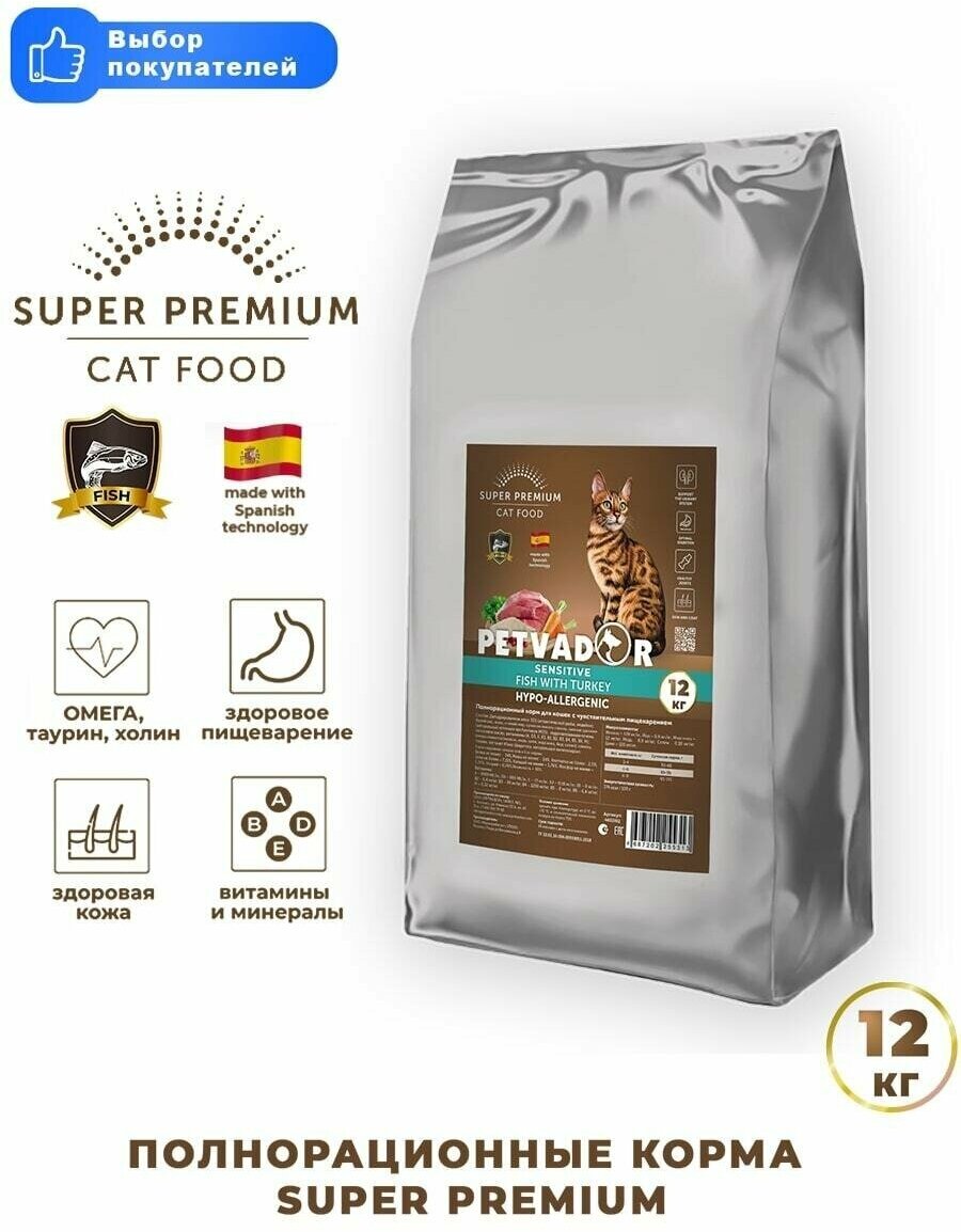 Petvador Полнорационный корм для взрослых кошек с чувствительным пищеварением 12 кг