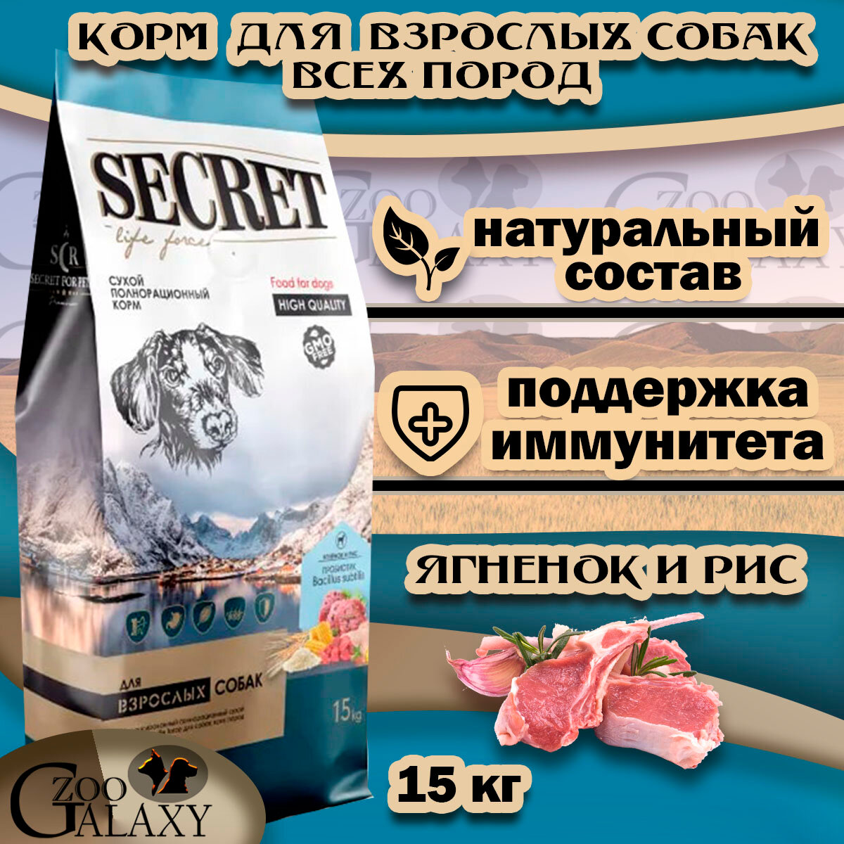 SECRET FOR PETS Корм для собак старше 18 месяцев ягненок, рис 15 кг
