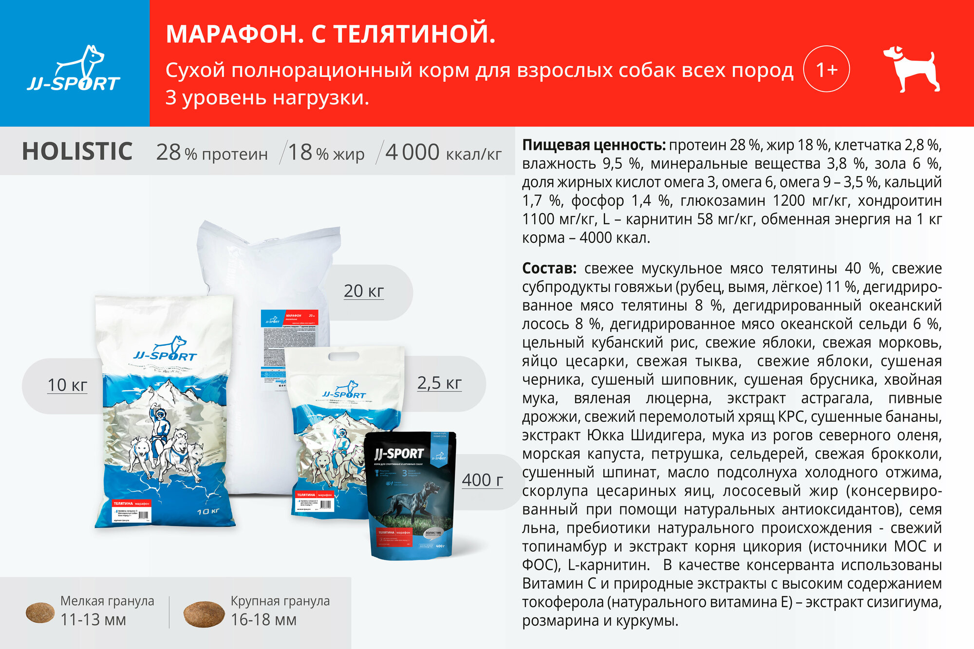 Корм JJ-Sport Марафон (крупная гранула) для собак с повышенной физической нагрузкой, регулярно занимающихся спортом, с телятиной, 2.5 кг
