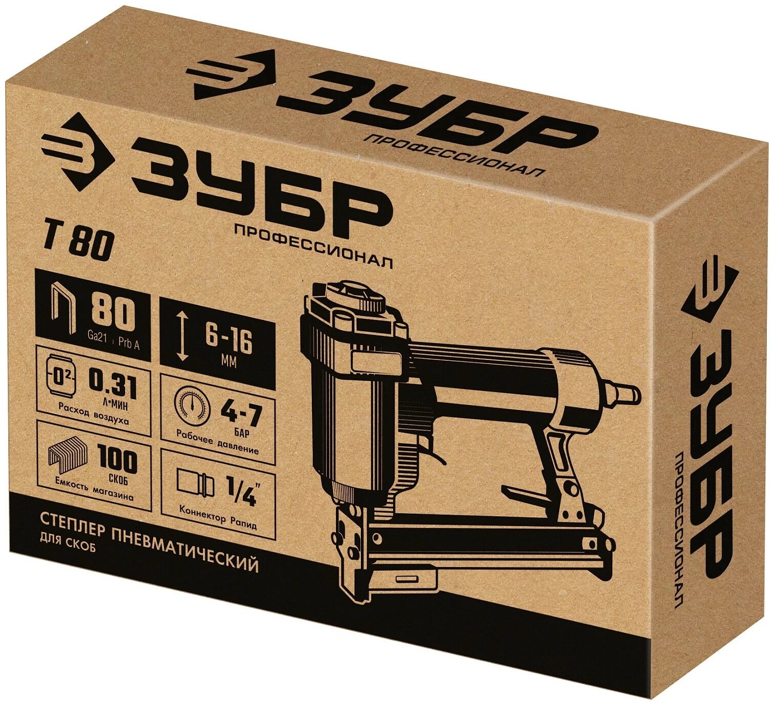 ЗУБР Т80, пневматический степлер для скоб 21Ga, тип 80 (6-16 мм), Профессионал (31938)