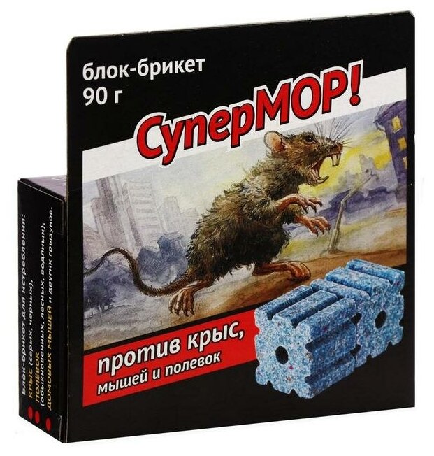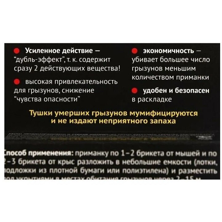 | Способ применения | приманку по 1-2 брикета от мышей и по 2-3 брикета от крыс разложить в небольшие емкости (лотки, подложки из плотной бумаги или полиэтилена) и разместить под укрытиями в местах обитания грызунов через 2-15 метров. |