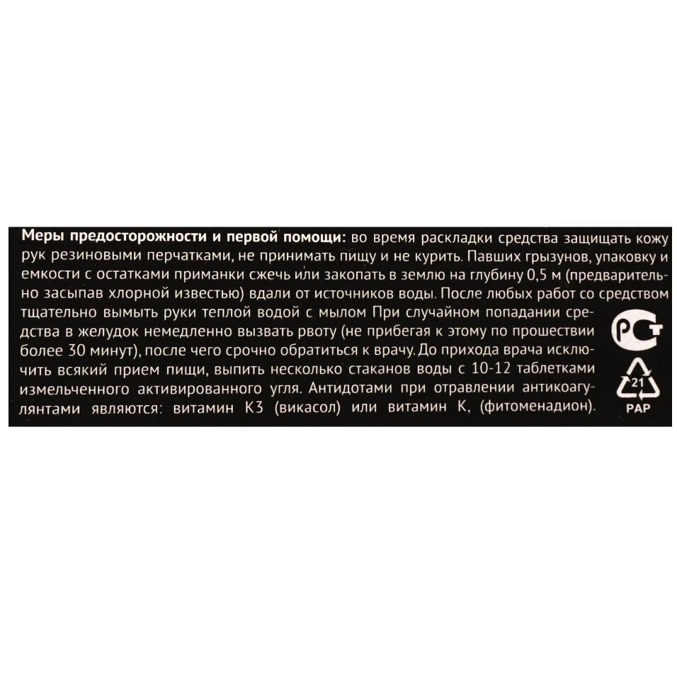 | Состав | бродифакум - 0,003%, зоокумарин - 0,008%, битрекс, парафин, краситель, масло растительное, сахар, ароматизатор, пищевые наполнители (мука, зерно, отруби, крупы) |