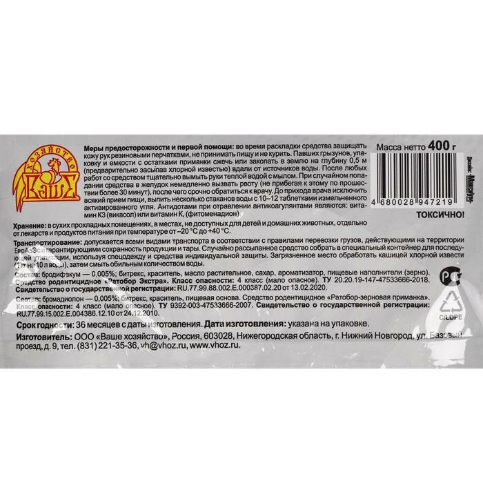 Ниже Вы можете прочитать отзывы на Зерновая приманка "Ратобор" MIX, 400 г./В упаковке шт: 3, ознакомится с подробными характеристиками, посмотреть интересные обзоры и фотографии на Зерновая приманка "Ратобор" MIX, 400 г./В упаковке шт: 3.