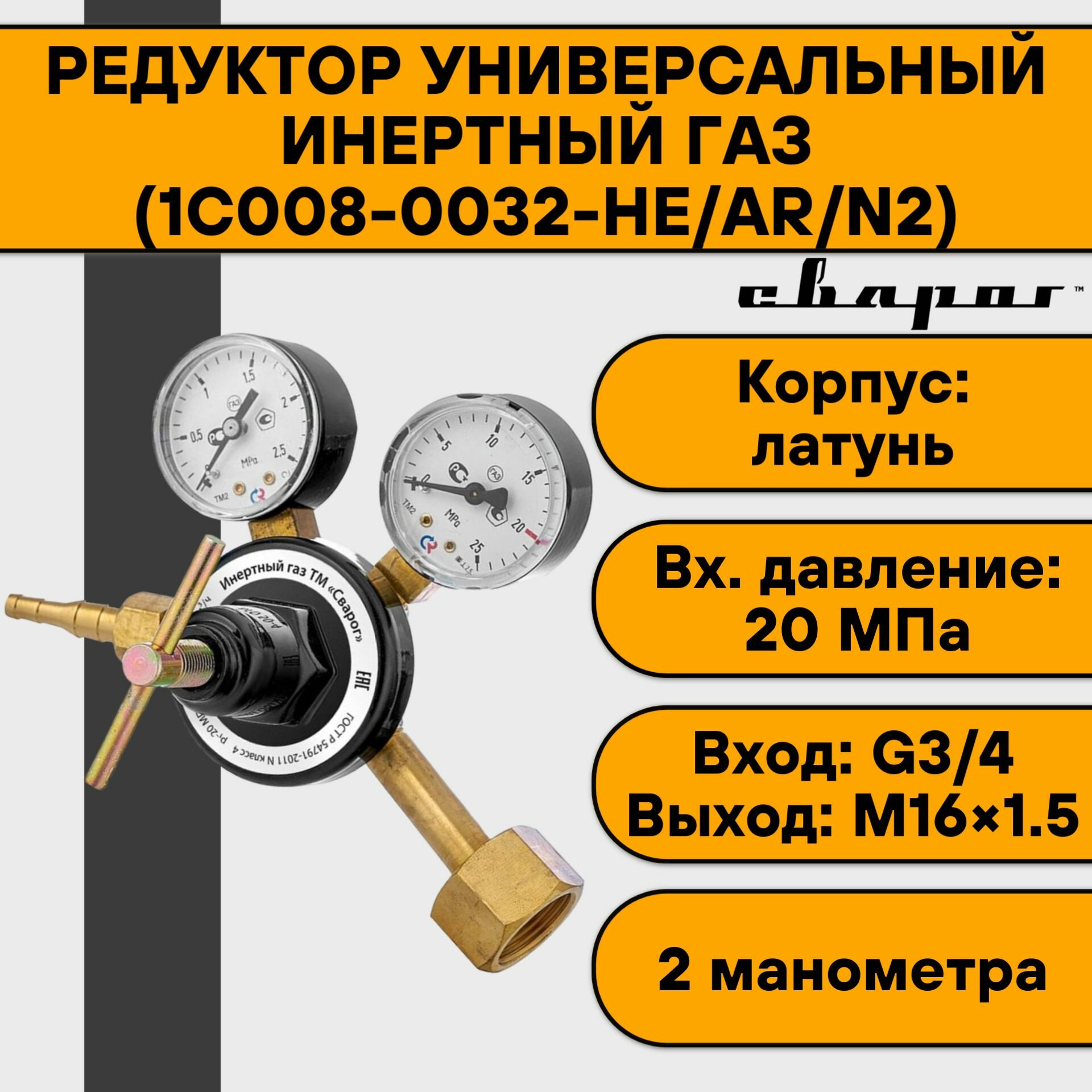 Редуктор универсальный Сварог Инертный газ (1C008-0032-HE/AR/N2), манометры с поверкой интересное: