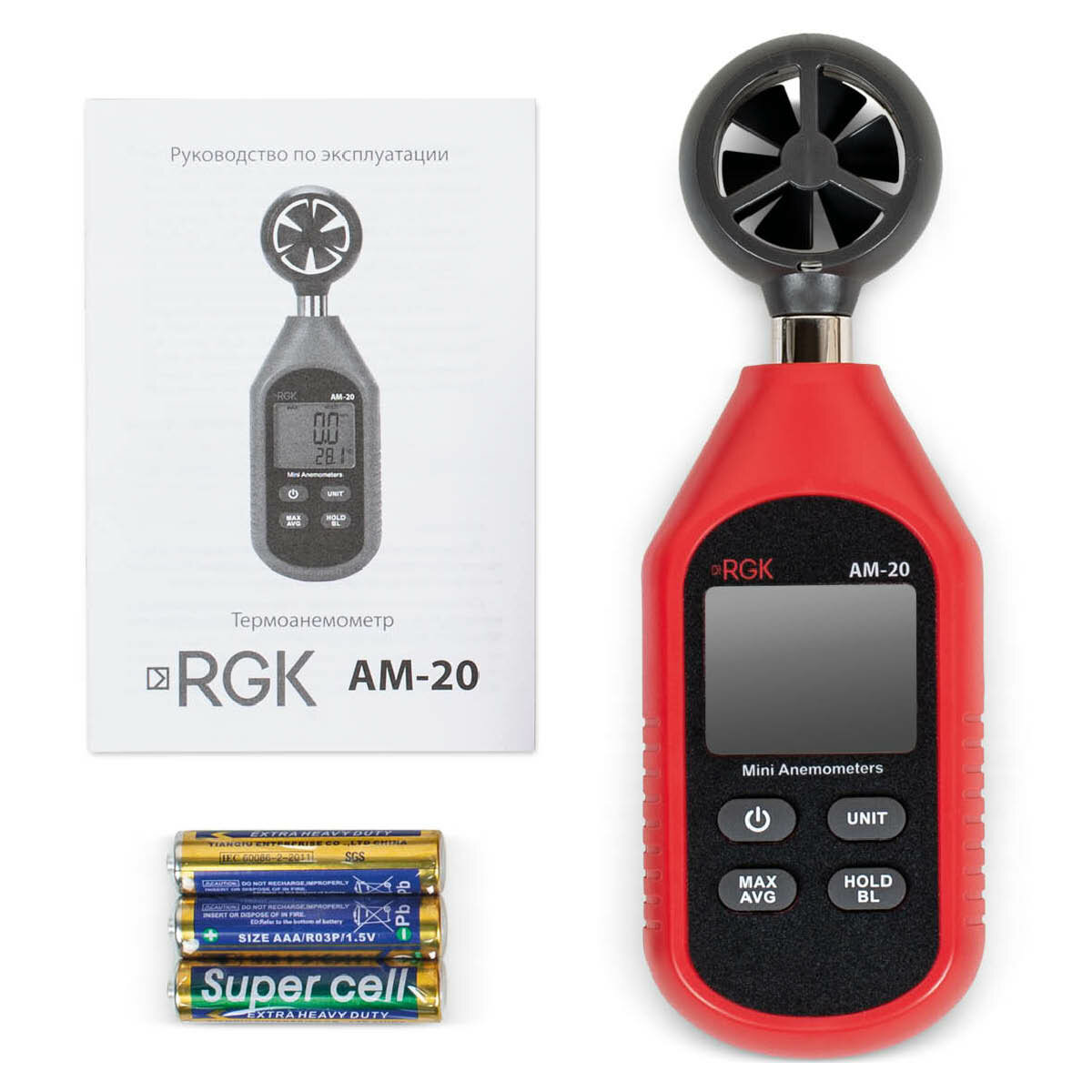 | Подробная комплектация | Термоанемометр RGK AM-20 с поверкой - 1; Батарея ААА - 3; Руководство по эксплуатации - 1; |