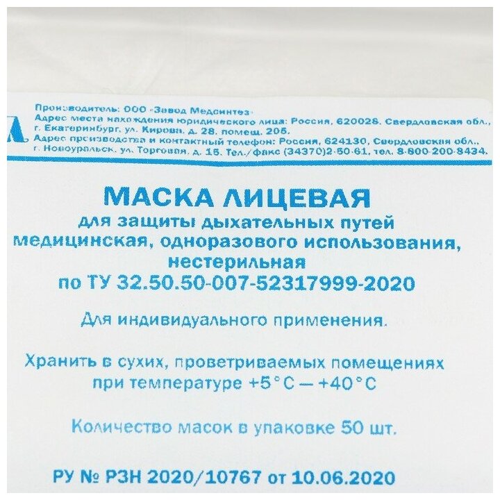 Маска медицинская, трехслойная, нестерильная, белая, 50 шт. в упаковке. интересное: