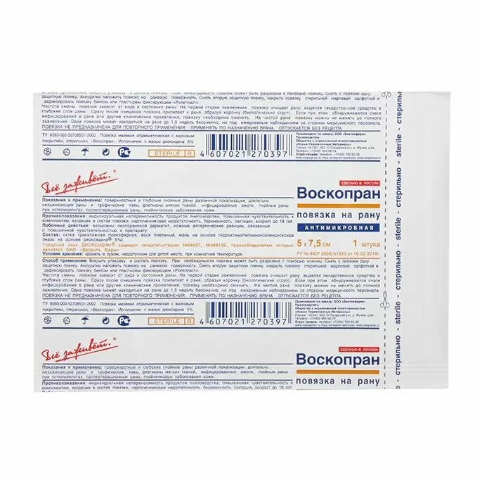 Повязка Воскопран антимикробная гидроксиметилхиноксалиндиоксида 5 мазью, 5х7.5см, 5шт, 110123М