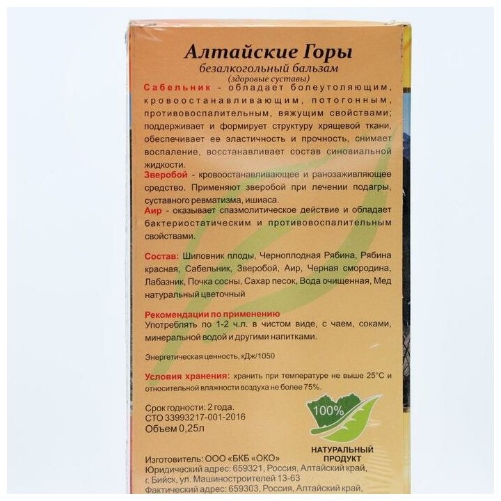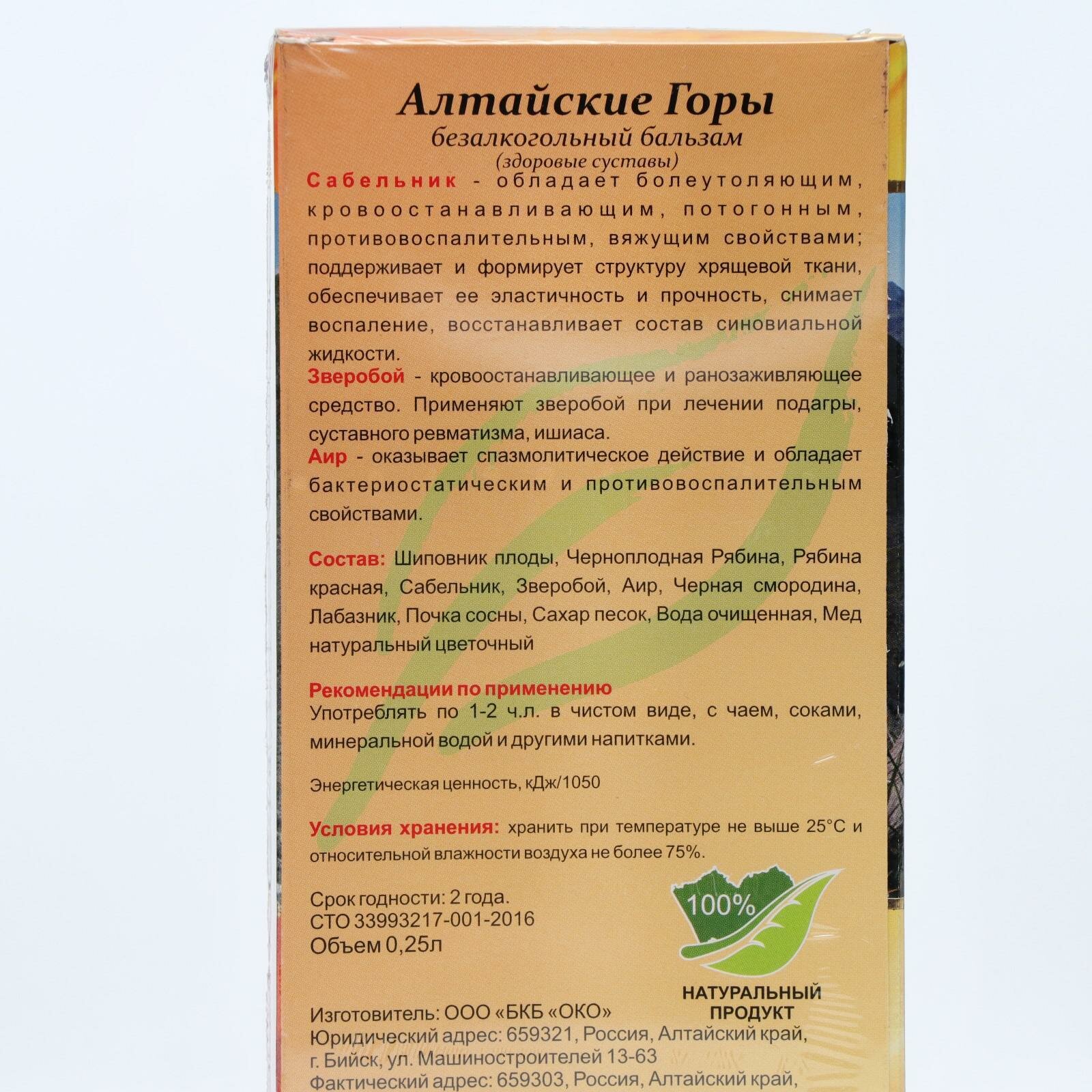 Безалкогольный бальзам "Алтайские Горы" Здоровые суставы, Золото Алтая 250 мл