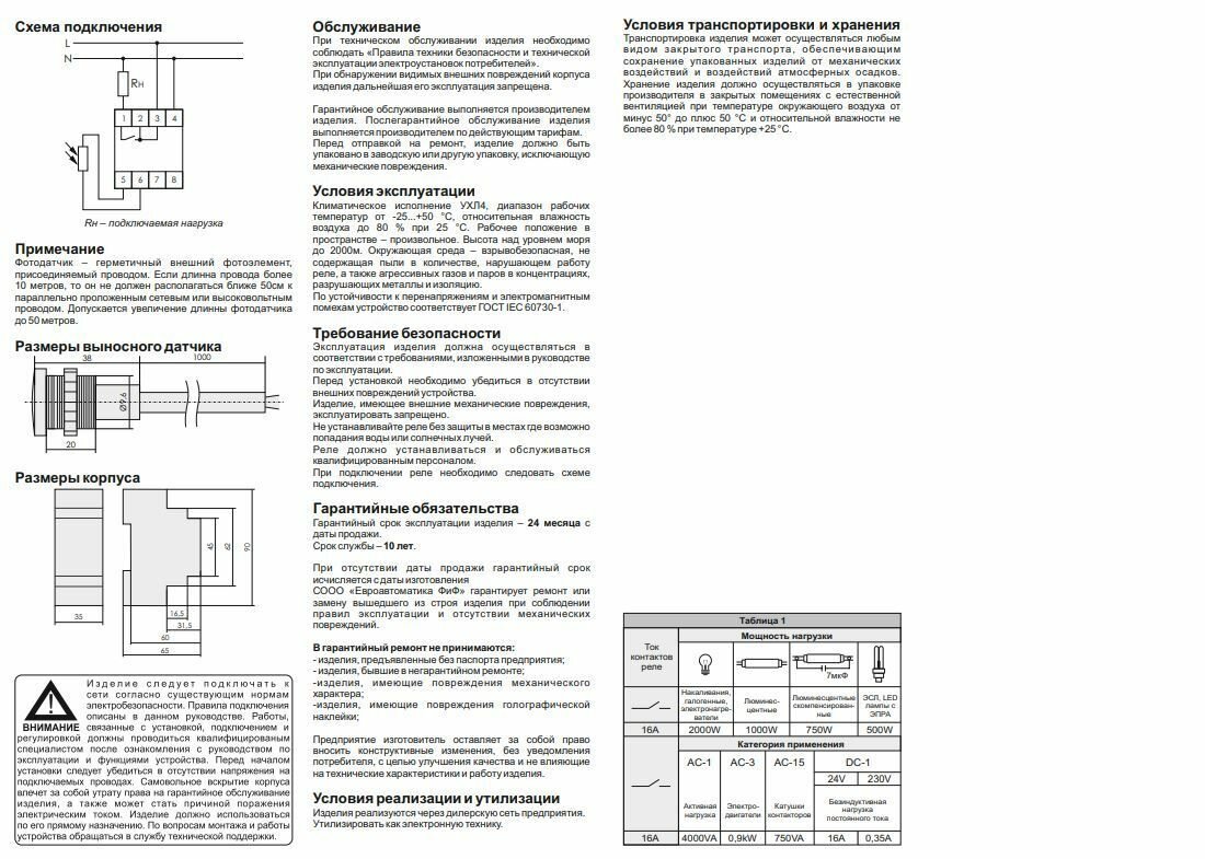 | Дополнительная информация | Выносной фотодатчик. Максимальный ток нагрузки - 16 А. |