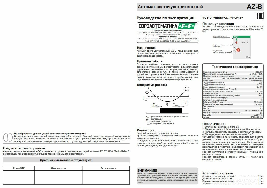 Фотореле F&f AZ-B, выносной фотодатчик, максимальный ток нагрузки - 16 А, EA01.001.009 интересное: