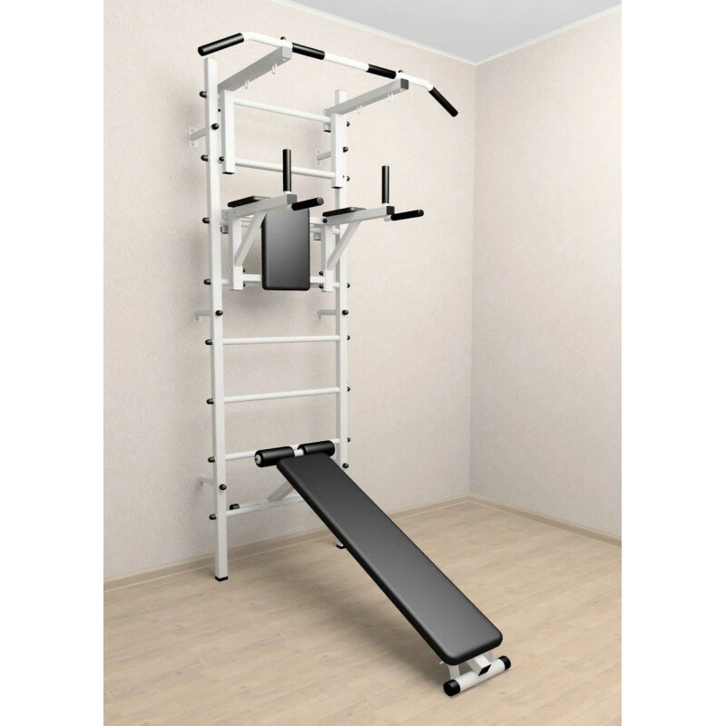Шведская стенка Sv Sport усиленная 605б (ступени Белые / Турник стандарт к ШС / Брусья Sv Sport к ШС / Скамья для пресса и жима к ШС)