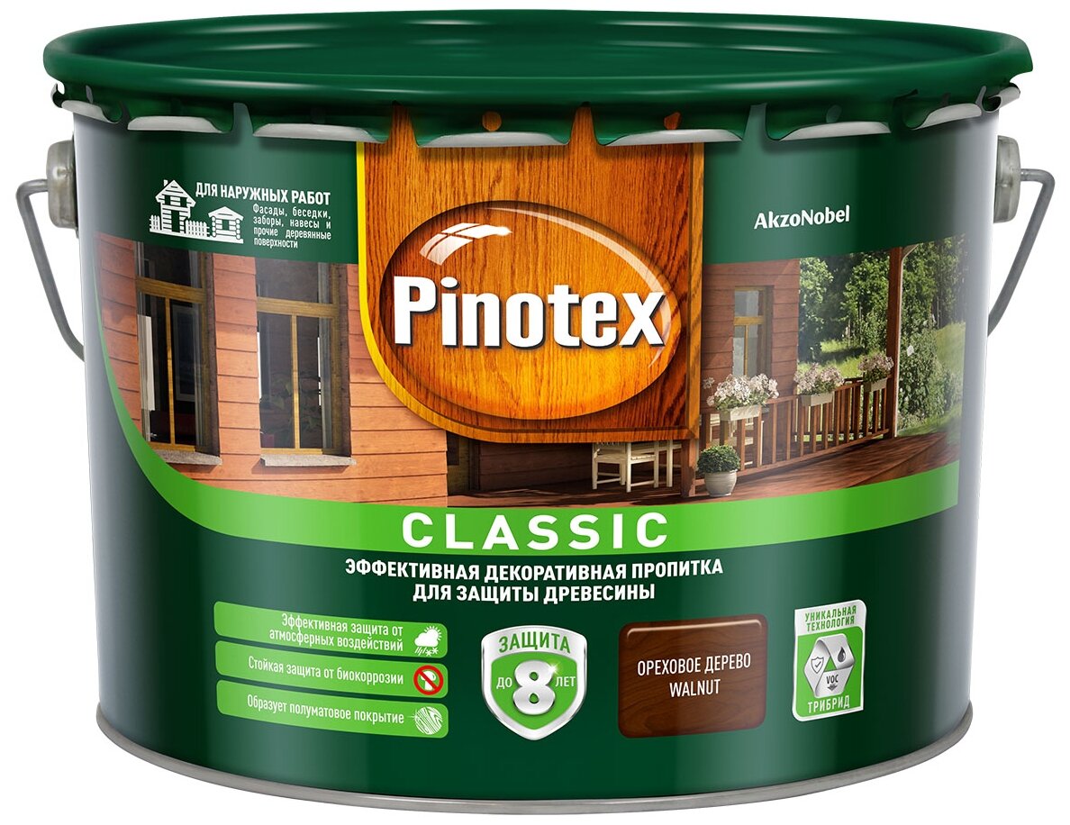 Ниже Вы можете прочитать отзывы на Пропитка декоративная для защиты древесины Pinotex Classic ореховое дерево 9 л., ознакомится с подробными характеристиками, посмотреть интересные обзоры и фотографии на Пропитка декоративная для защиты древесины Pinotex Classic ореховое дерево 9 л..