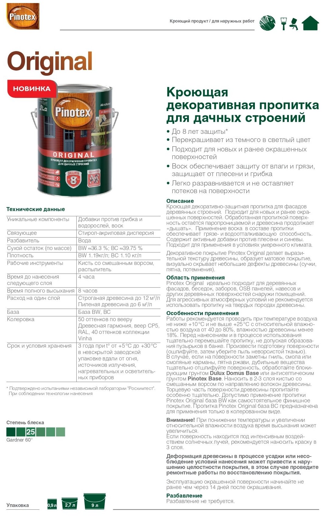 Пропитка кроющая для деревянных строений ORIGINAL, полуматовая, база BC Pinotex 2.5л.