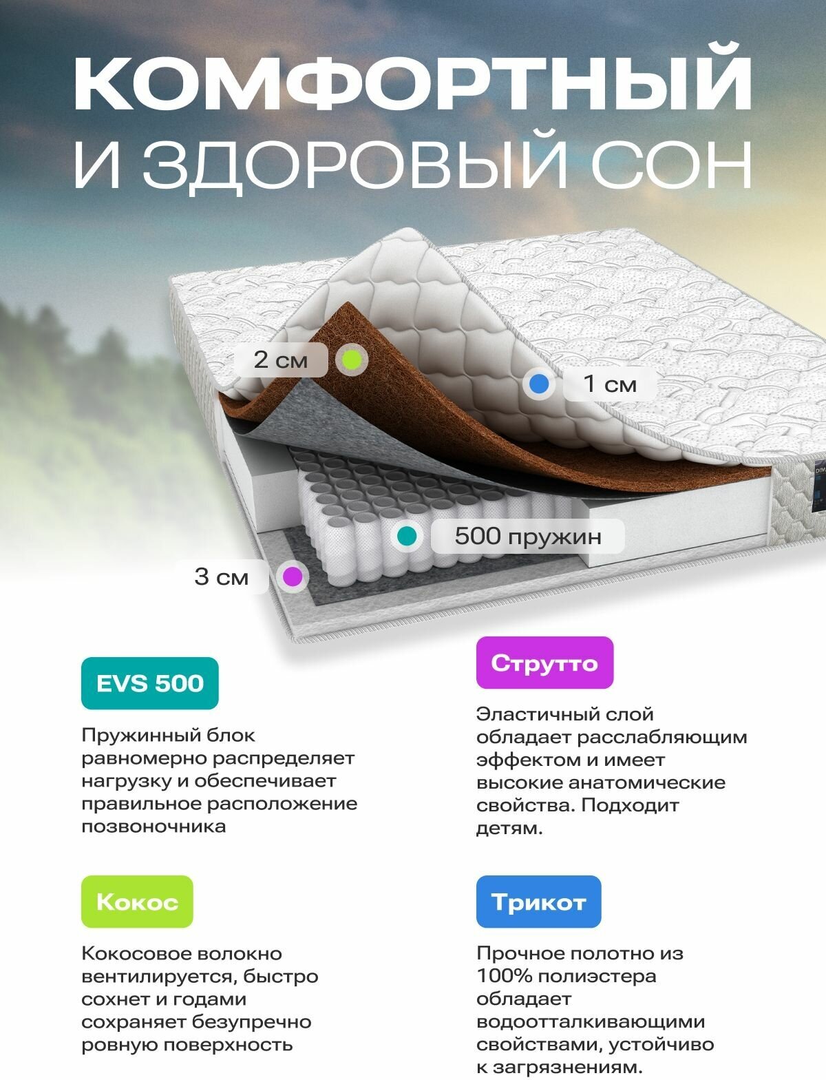 Матрас имеет независимые пружинные блоки, что делает его безшумным, долговечным. Натуральные наполнители позволяют телу дышать и обладают ортопедическими свойствами. Ткань поверхности очень приятная. Имеет 2 уровня жесткости-средняя и выше среднего. Матрас доставили до дверей в свернутом виде, после распаковки принял нормальную форму в течении 3 часов. Матрас действительно комфортный и удобный. Первая ночь доказала это, спала как ангел, проснулась без боли в спине, чего давно не было в связи со сколиозом и межпозвоночными грыжами. Спасибо за отзывы, которые помогли мне в выборе и производителю за мой крепкий сон теперь! Теперь надо искать подушку) |