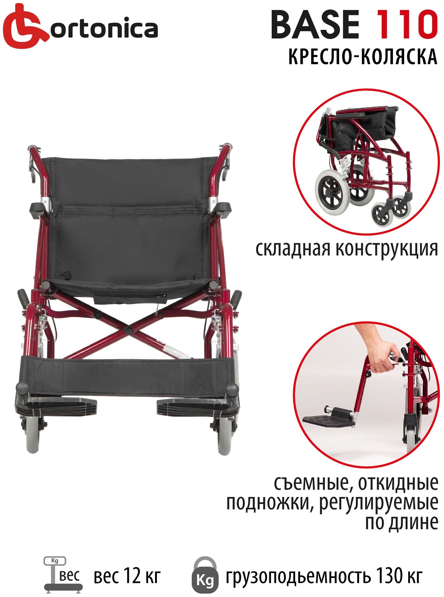 Кресло-коляска каталка механическая инвалидная складная легкая с усиленной рамой Ortonica Base 110 ширина сиденья 48 см