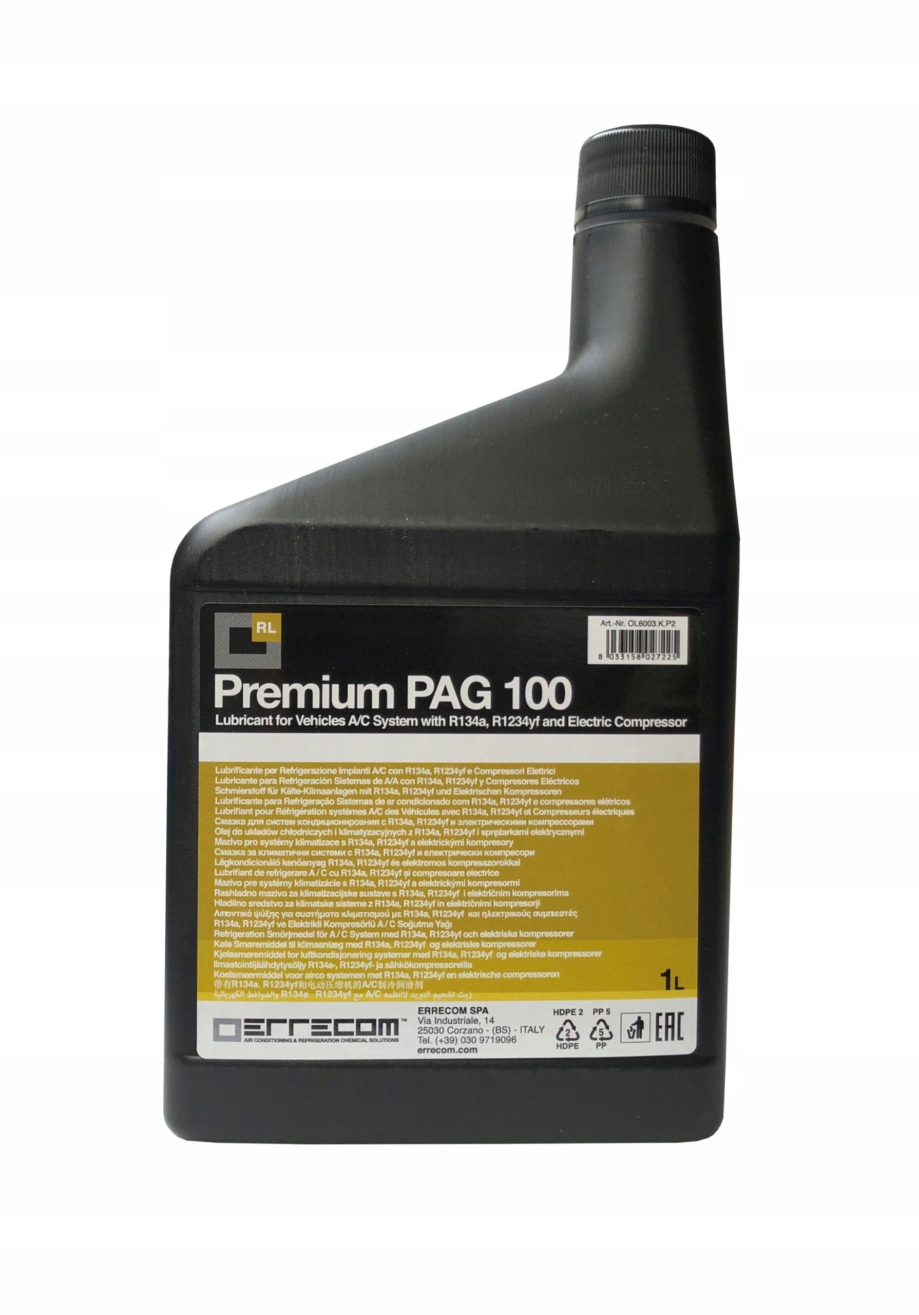 Масло Errecom Premium PAG 100 для автомобильных кондиционеров, 1л. Для хладагента R134a, R1234yf. Арт. OL6003.K.P2
