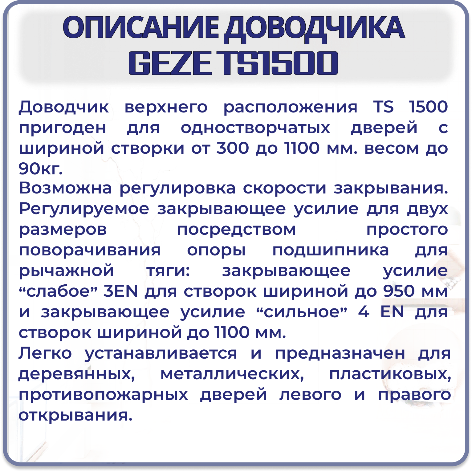 | Максимальный вес двери | 90 кг |